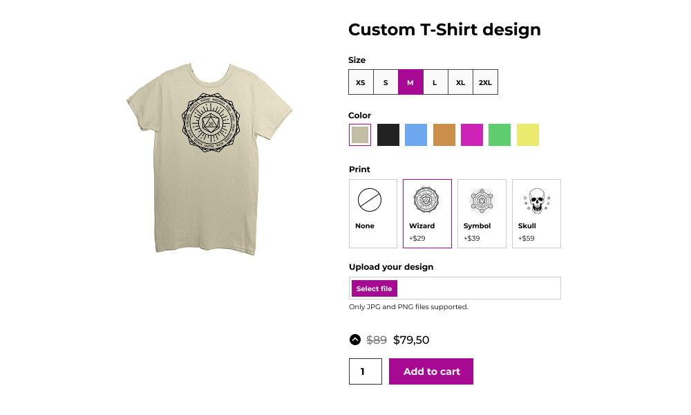 The plugin includes various types of price updates for free. You can set additional cost for each option, add a discounted sale price and even charge cost per unit using input fields. This allows you to charge cost per character or per numeric value.
