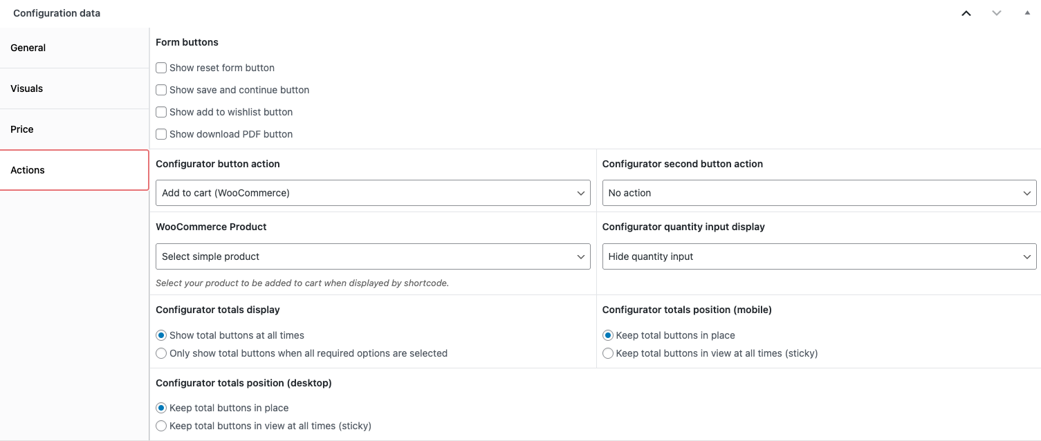 Finally you can control the configuration form actions in the “Actions” tab. This tab contains the button actions you want to incorporate in the form. For example, add to cart and request a quote.
