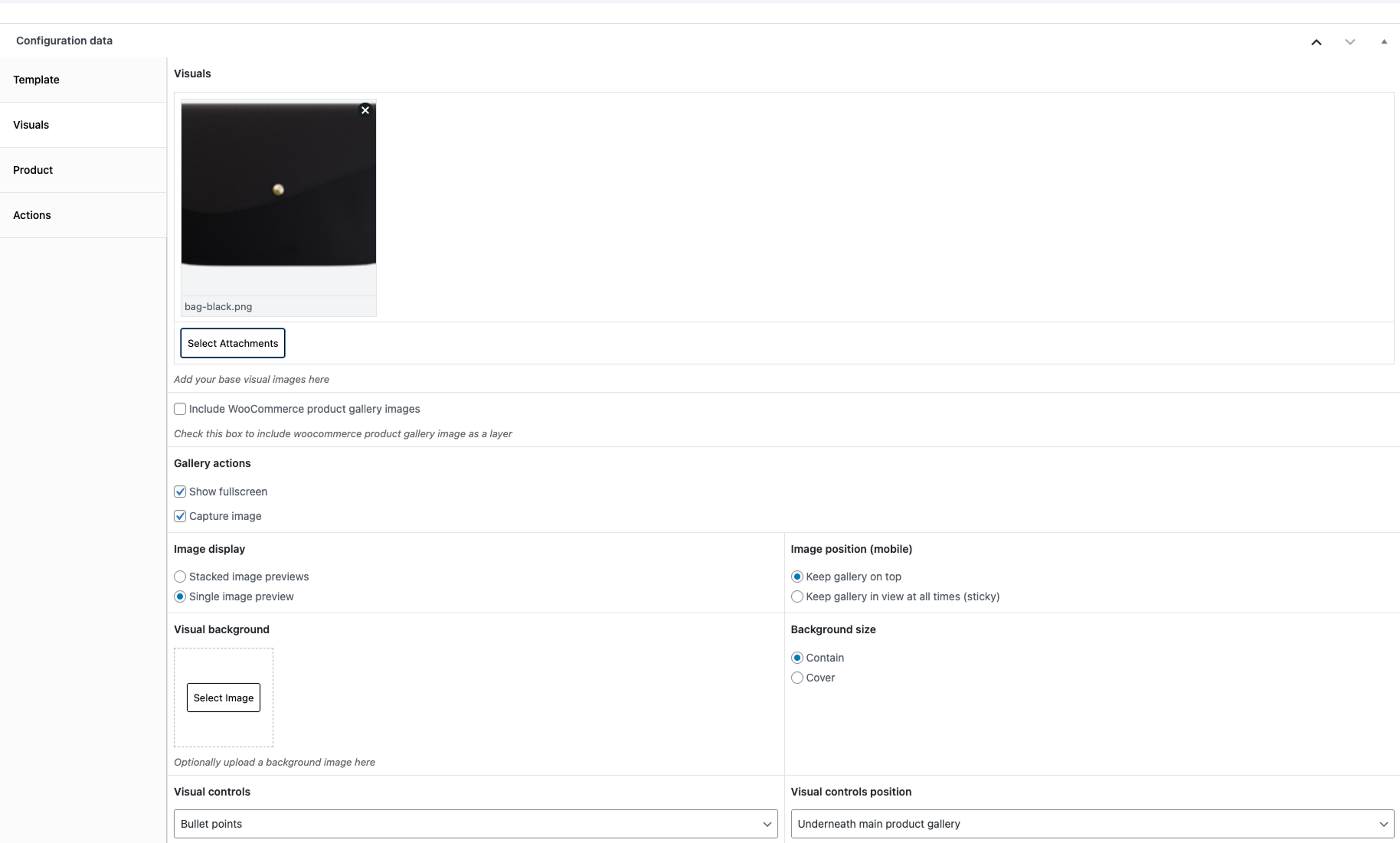 In the visual options you can control the display of the visual representation of the configuration. Depending on your configuration visual type this is either the image gallery or the 3D model viewer settings