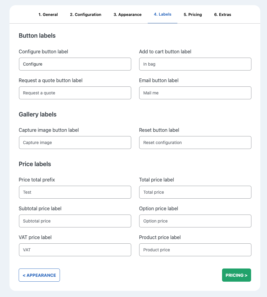 In the fourth step you can set the default button labels and price labels. On the settings page, you have more granular control of each label in the configuration form.
