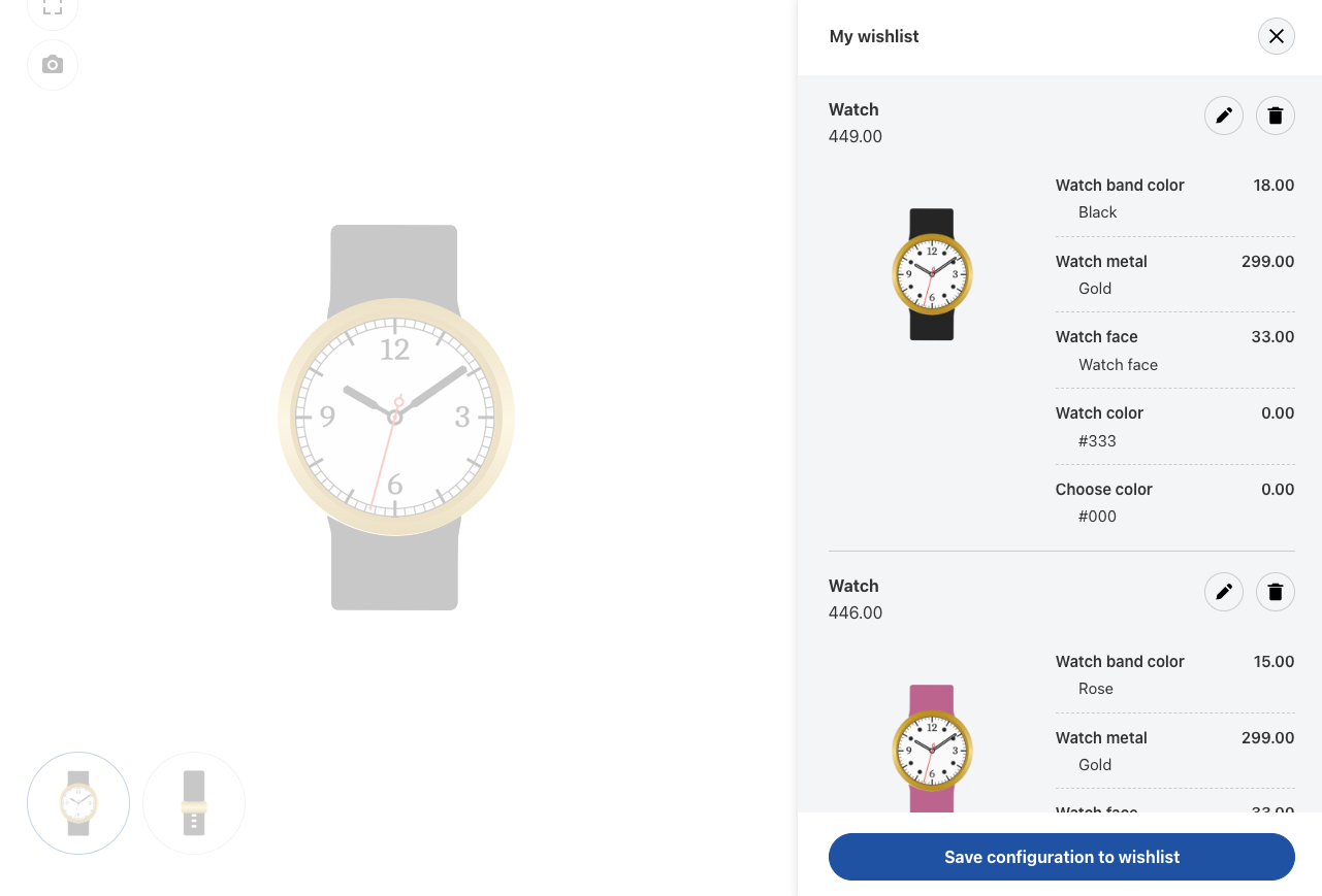 WCB configurator builder has built-in features for share links, wishlist and save for later. Start your 14 day trial period to check out these amazing features for free.