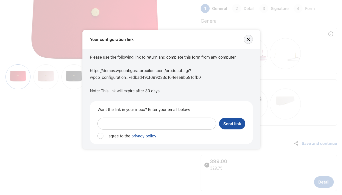 The WCB configurator builder form actions add-on also enables you to generate unique URLs that store all selected options. Instead of requiring customers to create an account, the save function can work by sharing, bookmarking, or emailing the link.