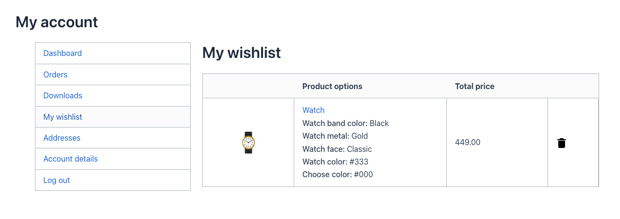 The WCB form actions add-on also comes with an option to store wishlist items in the WooCommerce account area, ensuring seamless integration with the WooCommerce ecosystem.
